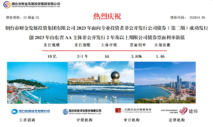 10月24日,煙臺財金集團(tuán)2023年面向?qū)I(yè)投資者非公開發(fā)行公司債券(第二期)在上交所成功發(fā)行!本期債券發(fā)行規(guī)模10億元,期限3年(2+1),票面利率3.85%,全場認(rèn)購倍數(shù)1.46倍,創(chuàng)2023年山東省AA主體非公開2年及以上期限公司債券票面利率新低,也是集團(tuán)繼6月成功發(fā)行“23煙金01”公司債券后,半年內(nèi)再次刷新山東地區(qū)同級別同期限非公開發(fā)行公司債券最低利率記錄。本期債券發(fā)行由申萬宏源證券有限公司主承,聯(lián)合資信、天圓全會計師事務(wù)所及建緯律師事務(wù)所分別提供信用評級、審計和法律服務(wù)。