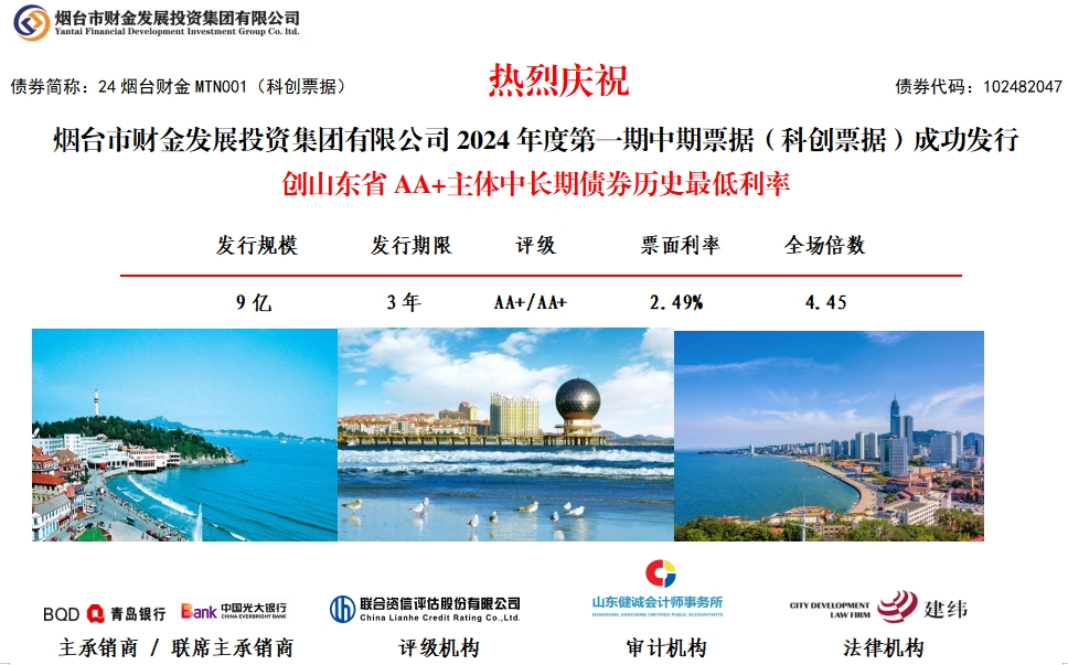 5月24日,煙臺財金集團2024年度第一期中期票據(科創(chuàng)票據)成功發(fā)行。本次中期票據發(fā)行規(guī)模9億元,發(fā)行期限3年,票面利率2.49%,全場認購倍數4.45倍,創(chuàng)山東省AA+主體中長期債券歷史最低利率。