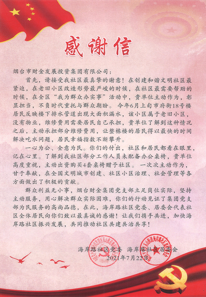 近日,集團(tuán)收到了一封“雙報到”社區(qū)寄來的感謝信,東山街道海岸路社區(qū)黨委、居委會代表社區(qū)全體居民向集團(tuán)黨支部在為民服務(wù)中主動擔(dān)當(dāng)、積極作為致以真誠感謝。
