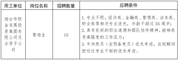 備注:市外首次來煙就業(yè)的35周歲以下(特別優(yōu)秀的年齡可適當(dāng)放寬)非應(yīng)屆畢業(yè)生,如有應(yīng)聘意向,可先通過管培生崗位應(yīng)聘,如符合煙臺(tái)市人才引進(jìn)政策,且順利通過集團(tuán)招聘考核,將根據(jù)應(yīng)聘人員工作履歷情況,結(jié)合集團(tuán)實(shí)際用工需求,主要分配到投資管理、融資租賃、保理、綜合文秘、運(yùn)營管理等工作崗位。